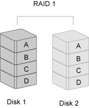 RAID 1 (Mirroring) consists of at least two drives storing duplicate copies of the same data. In this mode, the data is simultaneously written to two disks. Thus, the storage capacity of a two-disk array is combined into a single disk and the capacity is limited to the size of the smallest disk.